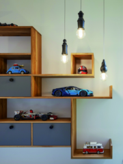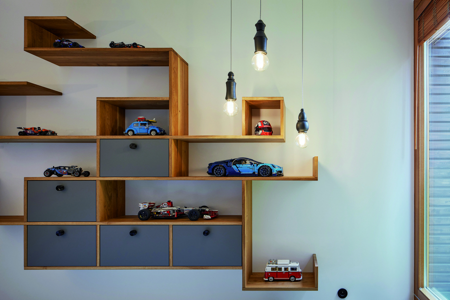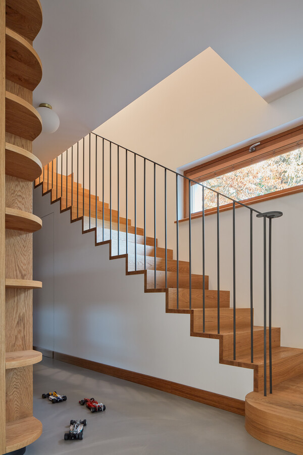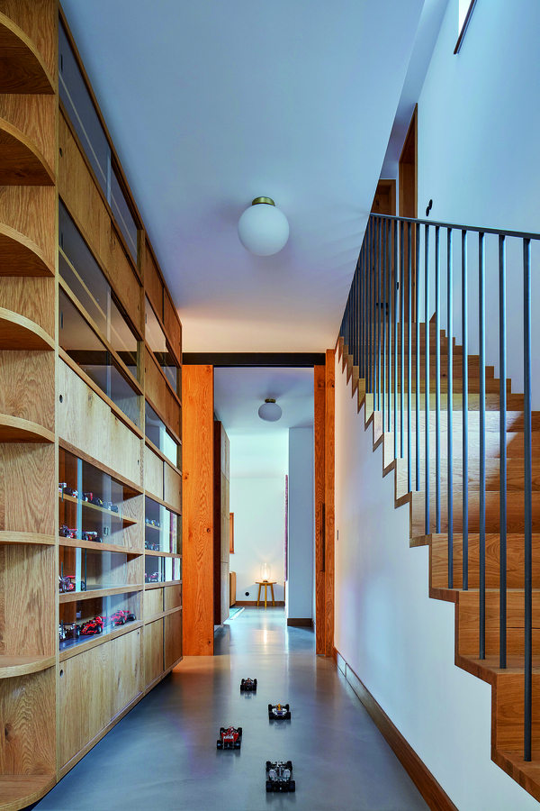 Центърът на дома е модул, проектиран и изработен специално за този проект. Той обединява кухня, библиотека и дневна в една плавна форма с множество функции. Дъбовият фурнир, изработен от едно-единствено дърво, придава на цялото обзавеждане естествена цялост – тактилна топлина, която свързва пространството като жив организъм. В хода на деня обитателите му правят естествена обиколка около него – с чаша кафе от кухнята, преминавайки покрай витрина с модели Formula 1, скрити шкафове, ниши с книги. Това е дом, който оживява с движението на обитателите си.