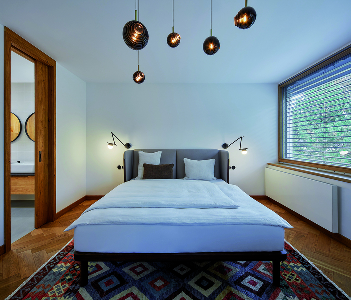 Интериорът е изграден от естествени и трайни материали – дърво, бетон, месинг, камък, стъкло и текстил. Осветлението и мебелите създават усещане за дълбочина и съвременен уют, в който се усеща духът на източноевропейската естетика. Проектът е реализиран в близко сътрудничество с местни майстори и занаятчии. Дори покривът е част от концепцията – превърнат в зелена градина, която осигурява естествена изолация и връзка с природата.