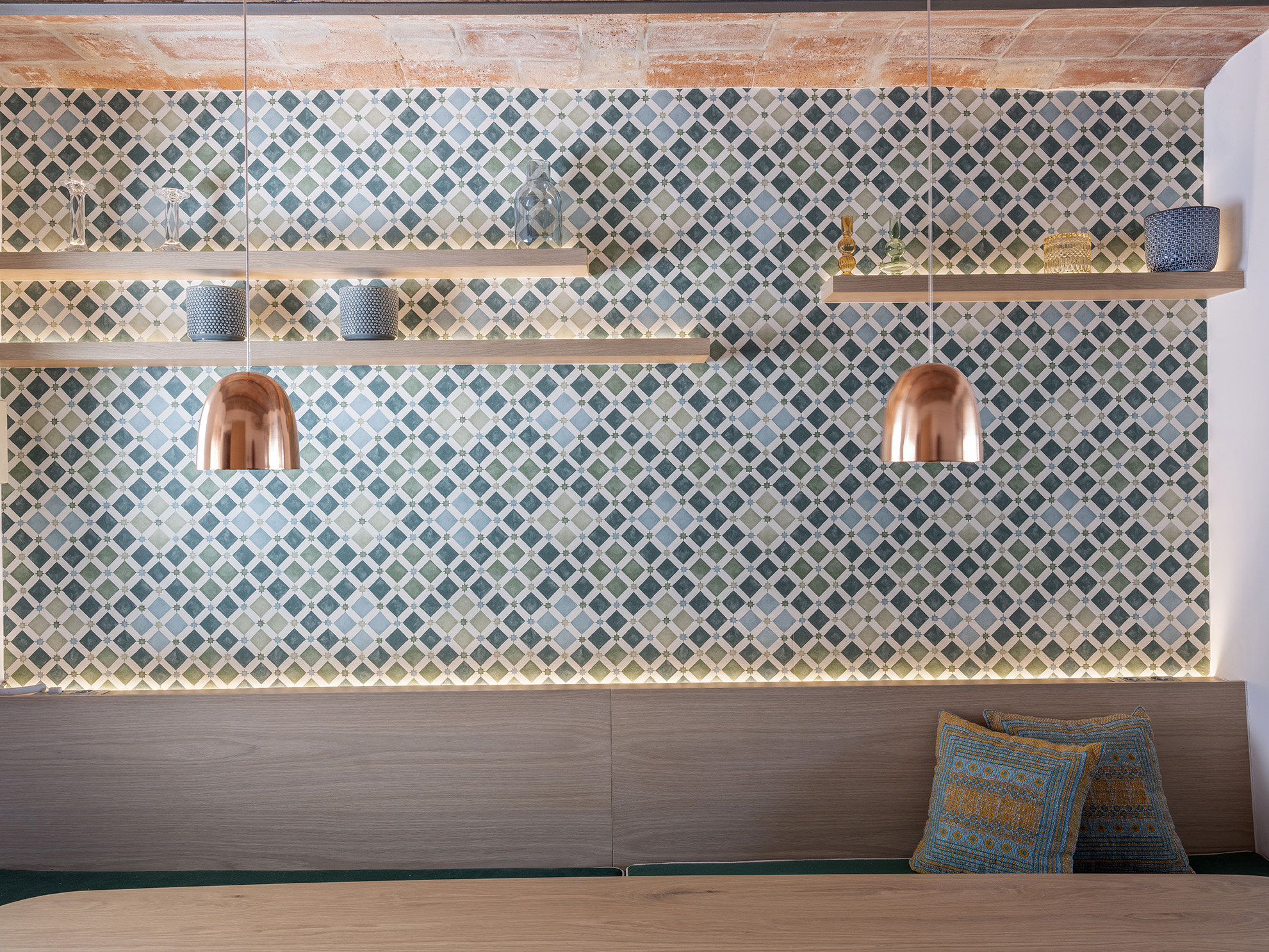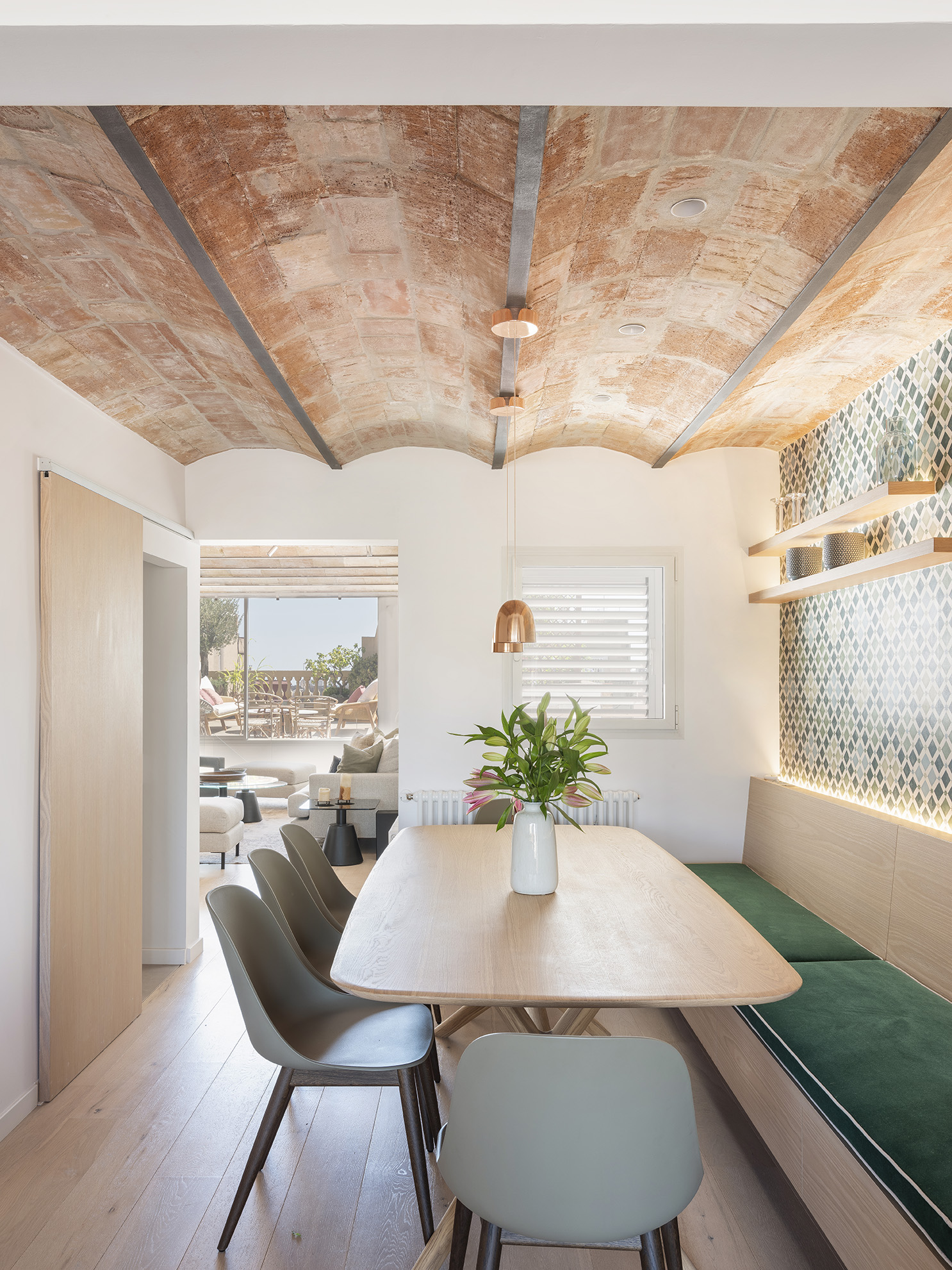 Дъбови стълби отвеждат към втория етаж, където централно място заема дневната с разкрити каталунски сводове и възстановен ориенталски килим. До нея е трапезарията, оживена от масивна маса, зелени акценти и стена, облечена в ръчно изработена керамика. Оттам пространството преминава естествено към кухнята с остров, от която се излиза директно към терасата за закуска.