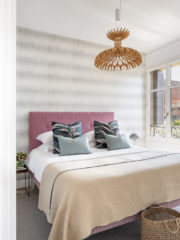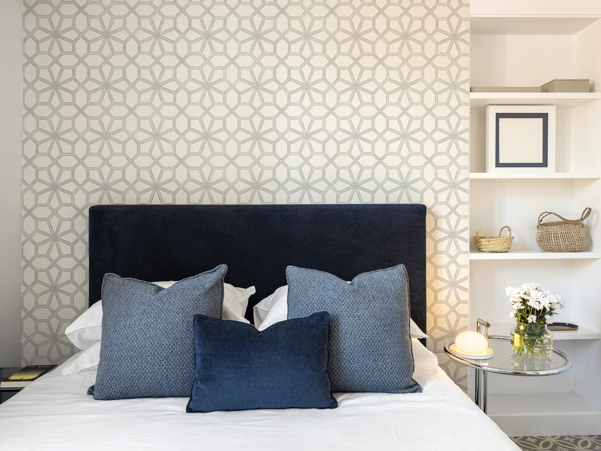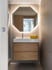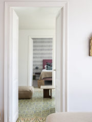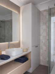 Фоайето на първия етаж посреща с огледала и деликатно осветление, които създават илюзия за безкрайност. Спалните носят различно настроение – от меки и неутрални тонове, навяващи спокойствие, до смели акценти и текстури, които съчетават удобство и артистична изразност. Баните залагат на естествени материали и функционалност, обогатени от фини декоративни щрихи. Цветна мозайка и малък кът за отдих са акцентът, разположен в преходното пространство, водещо към две от спалните.