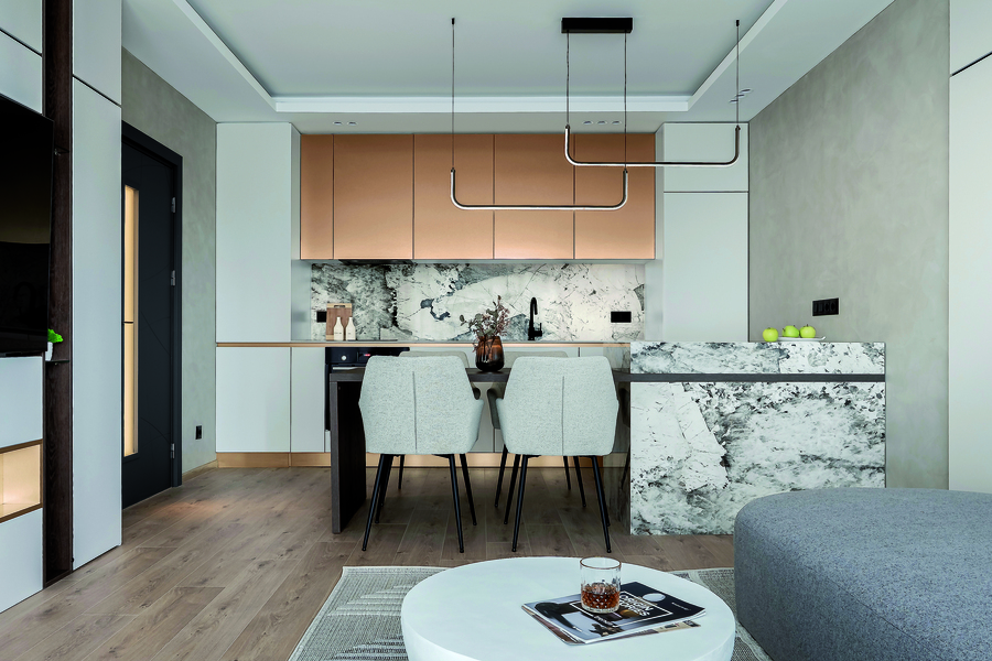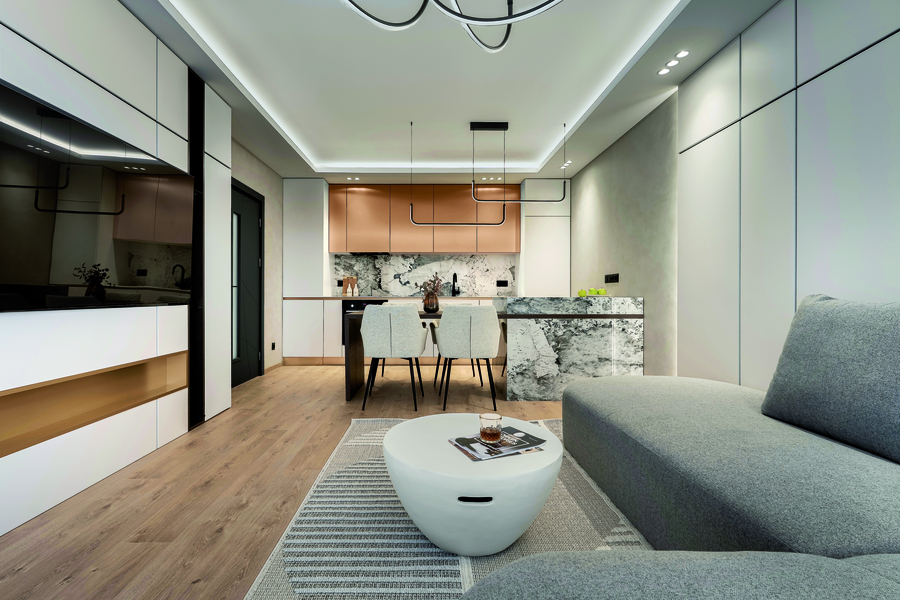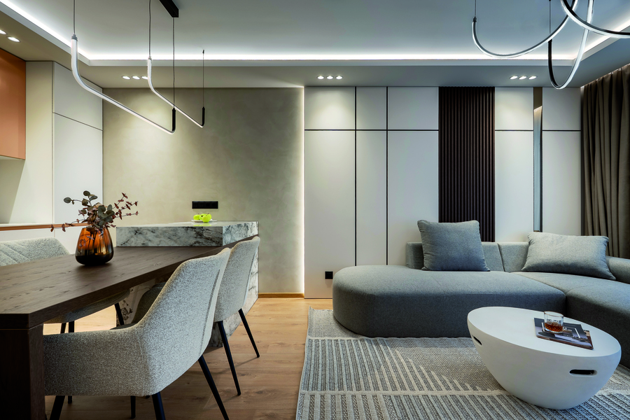 Меката мебел е в текстуриран текстил, който подсилва по-мъжкото, „джентълменско“ усещане — леко сурово, но едновременно комфортно и стилно. Скритото LED осветление, ламперийните панели и декоративните мазилки придават дълбочина и пластичност на пространството, без да го претоварват.
