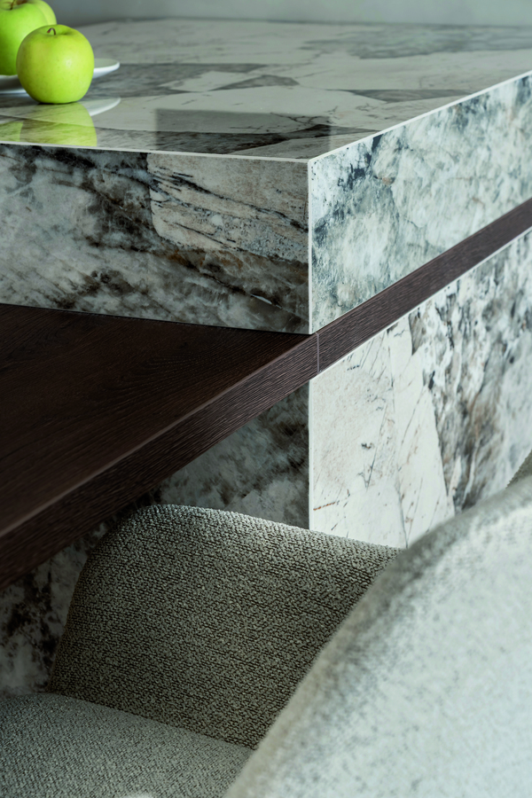 Проектът е разработен в рамките на бюджетно решение, като е използван висок клас ЛПДЧ с фина текстура, комбиниран с керамика, имитираща естествен камък — вложена като визуален акцент и с практическа цел: издръжливост и лесна поддръжка.