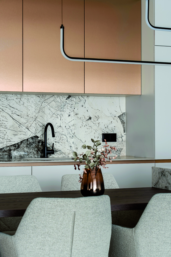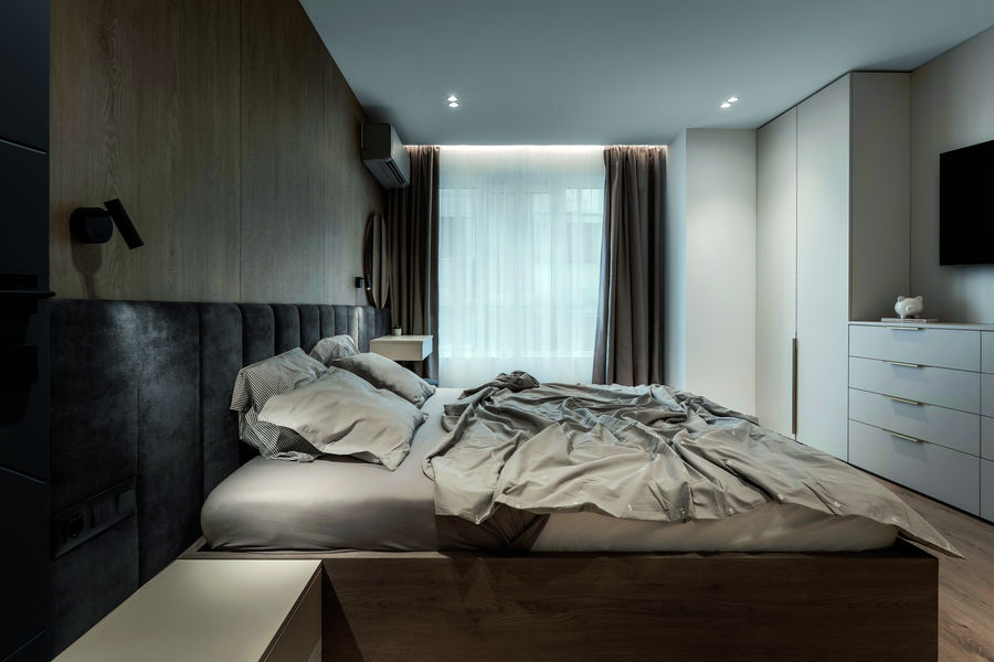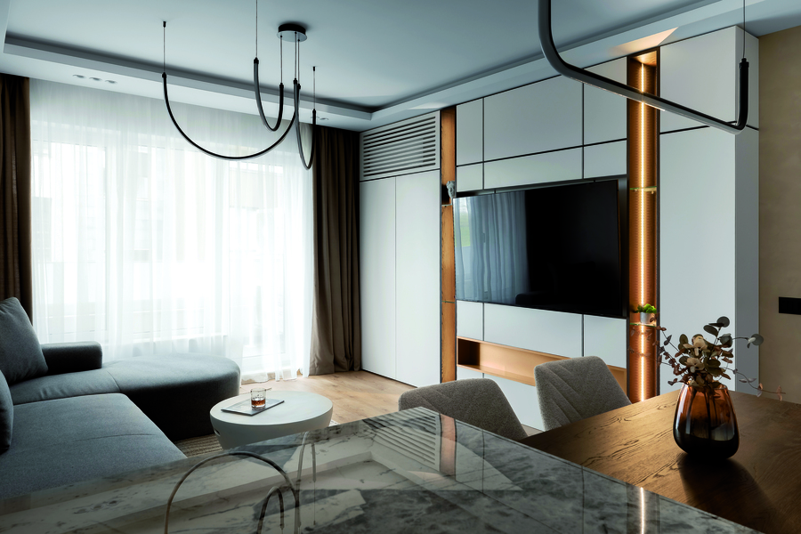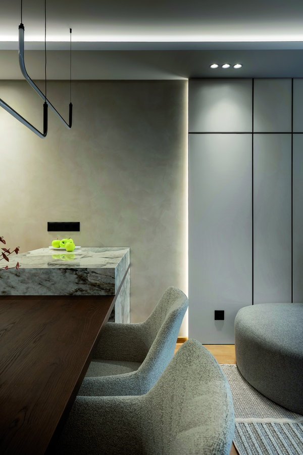 Естественото осветление в жилището е по-ограничено, тъй като апартаментът се намира на втори жилищен етаж и е в непосредствена близост до съседна сграда. Именно това налага създаването на добре обмислена и многостепенна осветителна схема. Проектирано е изкуствено осветление в няколко независими кръга, които позволяват гъвкав сценарий според различните моменти от деня и нуждите на обитателя — от приглушено и атмосферно, през акцентно, до пълноценно основно осветление. Така светлината се превръща в активен елемент на интериора, който моделира пространството и допринася за усещането за дълбочина и комфорт.