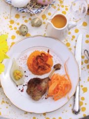 Приготвяне: Патицата се сварява, след което се запича докато придобие златиста коричка. Морковите се приготвят по три различни начина- на пюре, като чипс и като салата. За пюрето се сваряват и пасират. Към тях се прибавя течна сметана, масло, сол и черен пипер. За чипса се правят тънки ленти, които се поръсват със зехтин, сол и пипер и се запичат във фурната на 150 градуса, докато станат хрупкави. За салатата се правят също тънки ленти, които се овкусяват с дресинг от зехтин и портокалов сок. За редукцията от портокали се прави портокалов сок, който се оставя да намали обема си почти наполовина на слаб огън. Към него се прибавя лъжичка мед, сол, черен пипер Kampot и масло. Фенелът се задушава и се сервира като гарнитура.