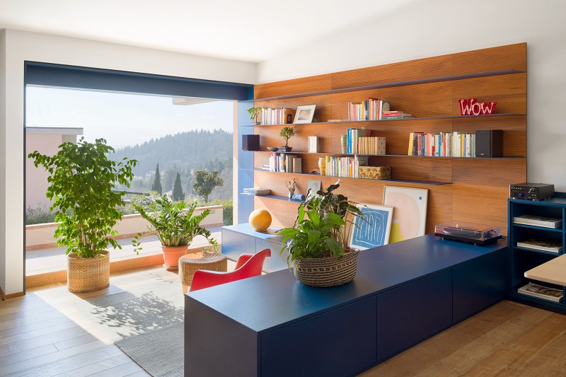 Апартаментът с площ 170 кв.м се намира в покрайнините на град Прато сред живописните тоскански хълмове. Проектиран е за младо семейство с интереси към пътешествията и планинското катерене. Централно място в него заема стълбището, което свърза двете му нива. На първото са разположени дневна, зона за четене и слушане на музика, трапезария и кухня. На второто се намират спалните, работен кът, бани и голяма тераса. Интересно решение е модулното обзавеждане, което е с основна роля в интериорния план. Практично, мултифункционално, то служи за подреждане, съхраняване, сядане и обединяване на пространството. Развива се в непрекъсната линия от дневната, през трапезарията, до кухнята, разделяйки условно отделните зони. Стълбата, свързваща двете нива, е разработена като акцент в интериора. Подобно на останалите елементи в дома, и тя е мултифункционална – част от антрето, в нея е интегрирана пейка за преобуване, място за закачване на дрехи, шкаф за подреждане на обувки, дори рамка за катерене. Синият цвят, използван за модулното обзавеждане, стълбата и на други места в дома, обединява стилово пространството, създавайки ведра, младежка атмосфера.