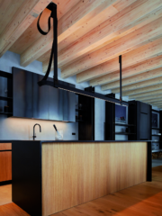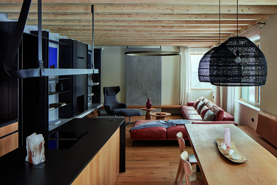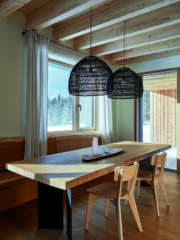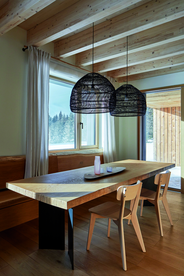 Основните материали са в естествената си форма – масивно дърво, черна стомана и бетон. Техният суров вид създава усещането за стабилност и отдава внимание на материалите и техните текстури.
