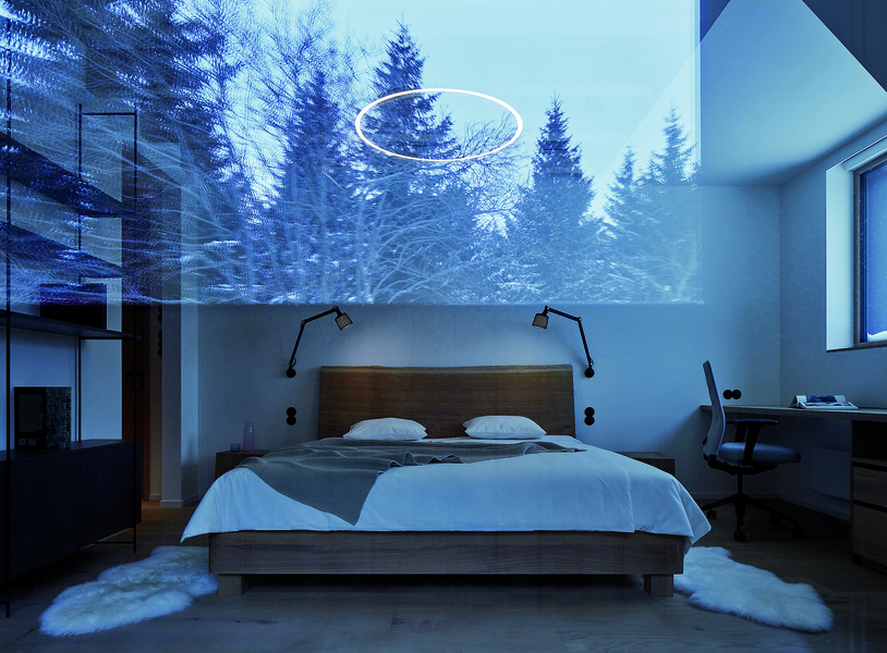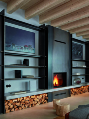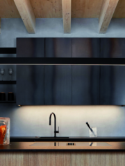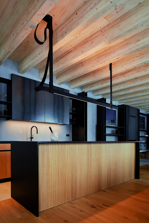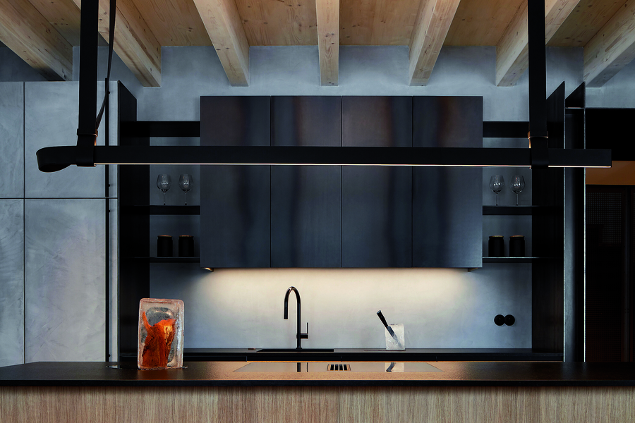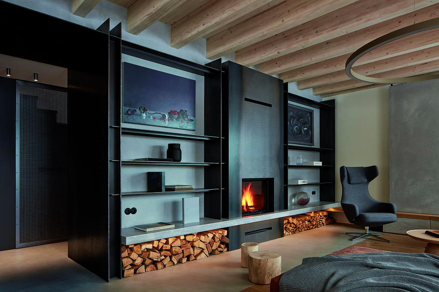 Черният метал, който улавя светлината през деня и придава дълбочина на интериора вечер, обединява библиотеката и камината в дневната. Същият материал преминава от там, през коридора и стълбището – като тънка линия, която свързва пространствата.