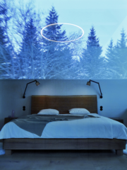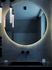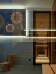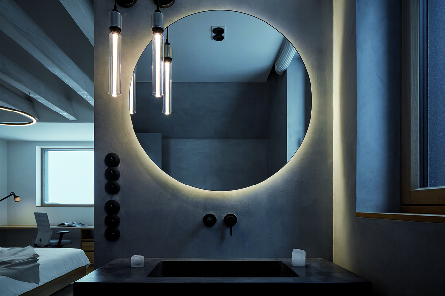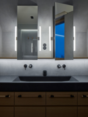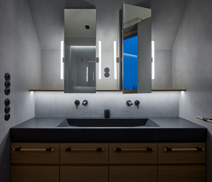 Дори в баните присъстват бетон и дърво, които  продължават този суров стил, омекотен от дискретна светлина и гледки към природата.