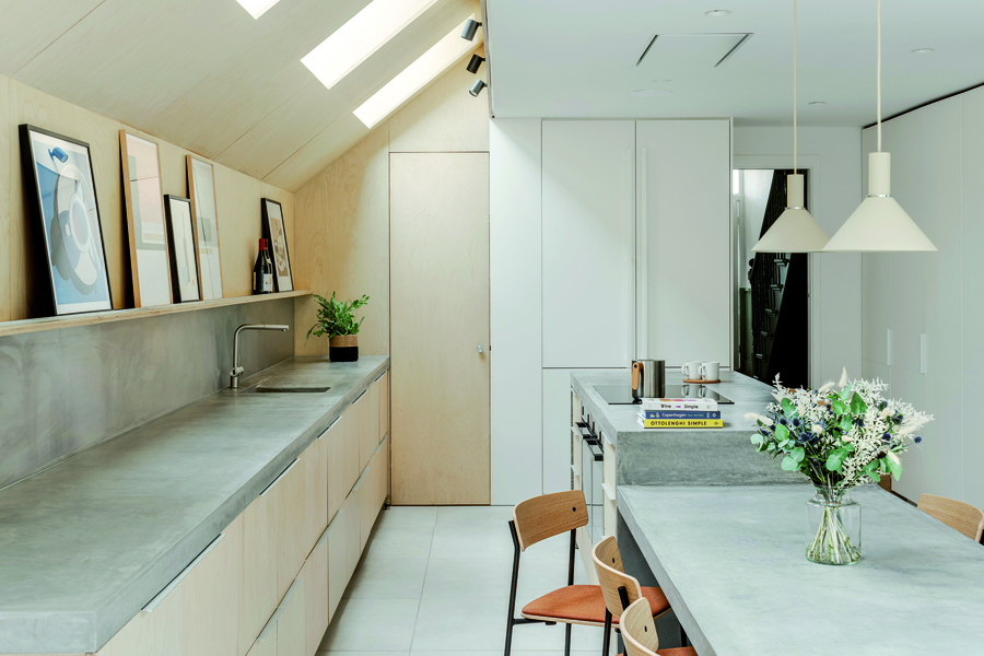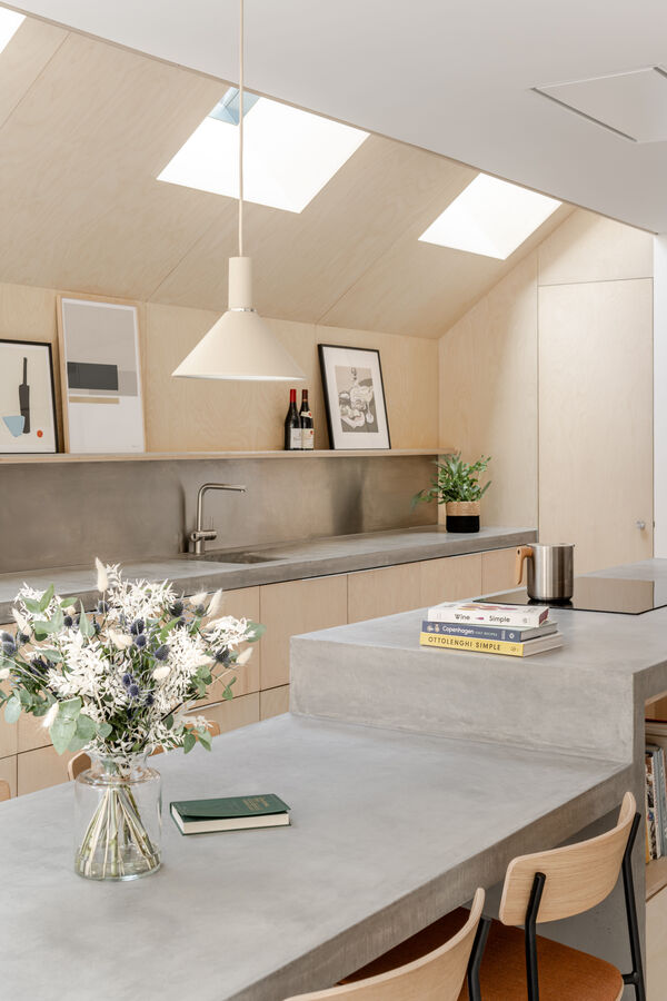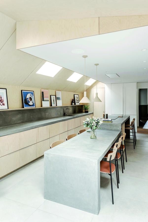 В центъра на новото пространство е разположен шестметров остров от лят бетон, който обединява функцията на кухненски плот и трапезна маса. Това е елемент, около който се организира ежедневието. Островът е обшит с брезов шперплат, изработен по поръчка.