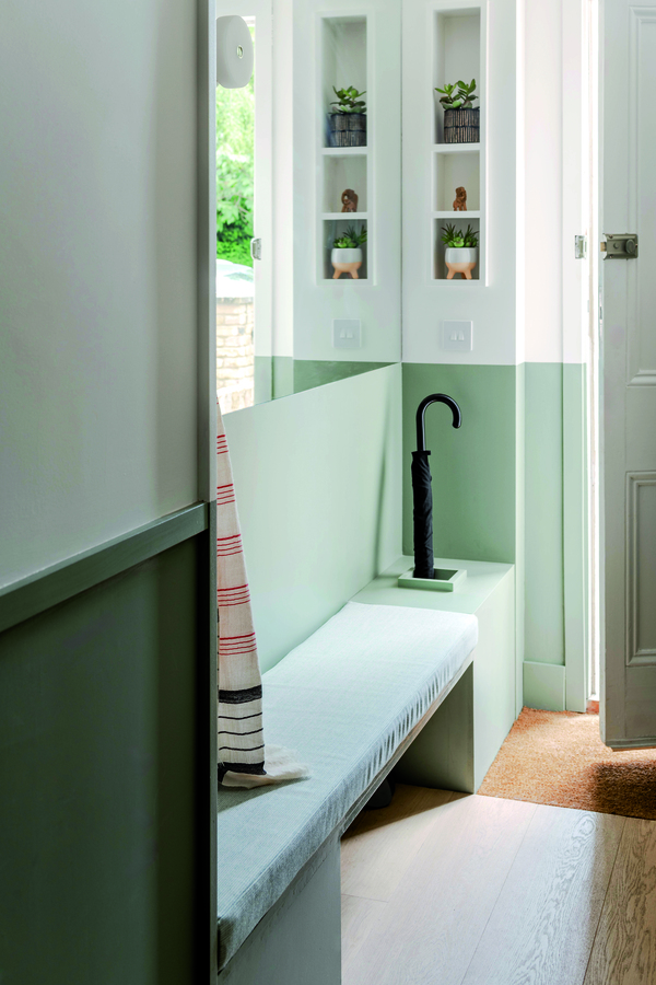 Макар много от оригиналните викториански елементи да са загубени през годините, проектът работи със съвременни интерпретации. Вратите напомнят класическите четирипанелни модели, а цветови акценти в долната част на стената оформят модерна версия на традиционна визия със стенна обшивка.