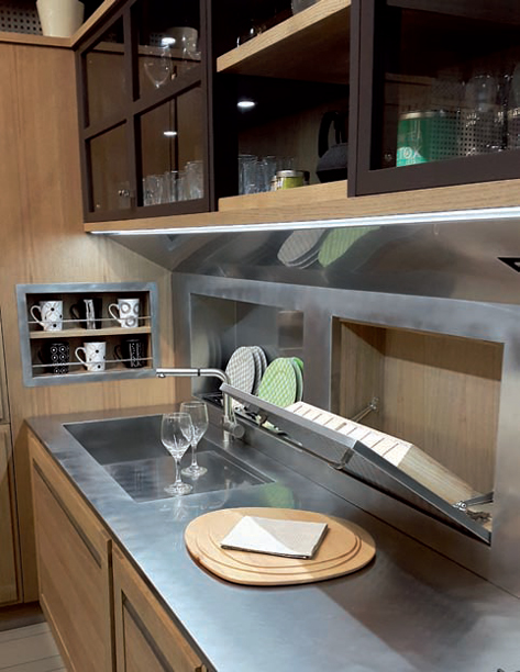 Всички кухненски уреди като керамични котлони, мивки, смесители и абсорбатори могат да изчезват и да се появяват, когато са нужни в островни и в разместващи се работни плотове. Колони със скрити врати, прибиращи се странично в корпуса, с механизъм за плавно затваряне и автоматично прибиране осигуряват възможност да бъдат скрити мивки, миялни, микровълнови фурни, кафе машини и други. Тази модулност на цялата система дава възможност за пълно персонализиране на желанията на клиента с множество възможности за оптимизиране на модулите.