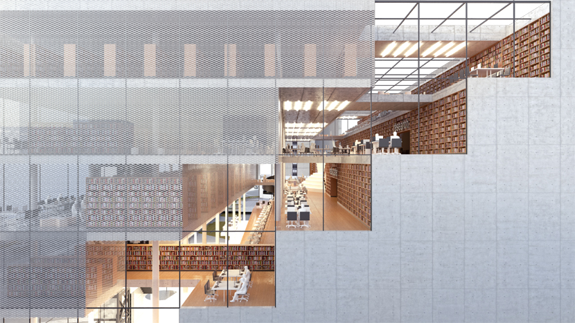 Обемът на сградата е разделен на три части. Едната е плътна и защитена. Образно казано, тя е гръбнакът на библиотеката. В нея са разположени хранилищата и административните помещения. Срещуположната част е полупрозрачна заради окачената структурна фасада. Диагонално и стъпаловидно, по средата между тези два обема, е разположена „прозрачна”, „отворена”, остъклена ивица, която разкрива вътрешността на сградата. По проект е предвиден и аудиториум, където могат да се провеждат различни обществени мероприятия.
