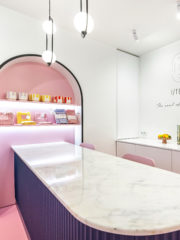 Деликатни бели рафтове по цялата стена приютяват представените продукти. Те са със  заоблени краища с цел постигане на повече мекота и цялостен хармоничен дизайн.