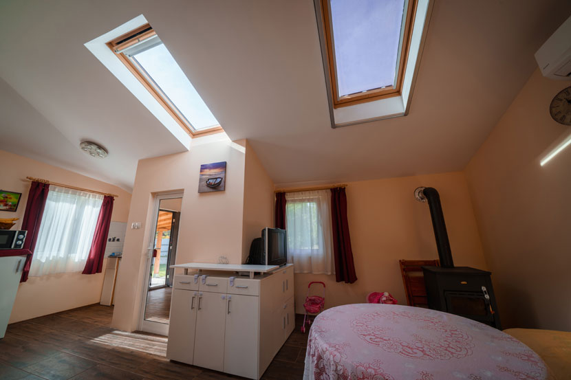 Едно от нещата, които карат тази къщичка за отдих да изпъква сред останалите постройки наоколо, са 4-те покривни прозореца – монтирани по два от двете страни на двускатния покрив. Те са поставени, за да създават усещане за простор, домашен уют и същевременно да осигуряват максимално количество дневна светлина във вътрешността на помещенията.